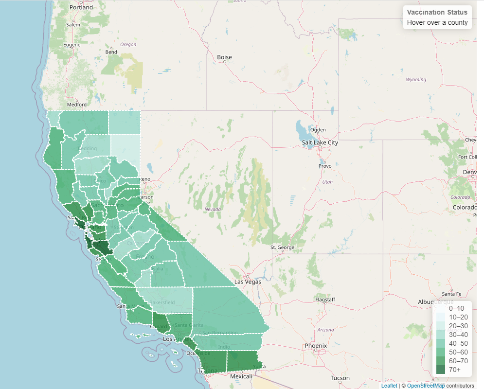In total, 9 out of 58 California counties are fully vaccinated above the State average 65% of the population.